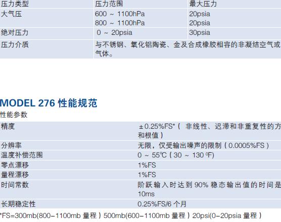 Setra 西特 Model 276大气压变送器 工业压力传感器性能参数: